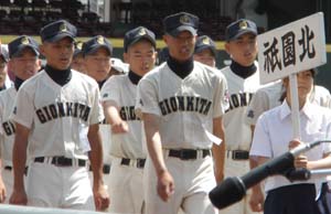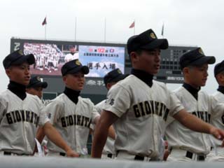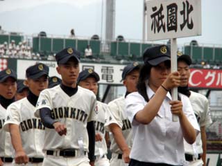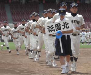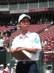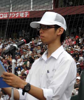 入場行進の司会をする放送部員 | 野球部の入場行進(砂かぶり席にて撮影) |