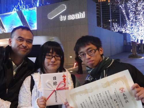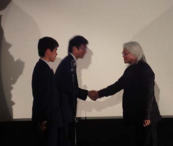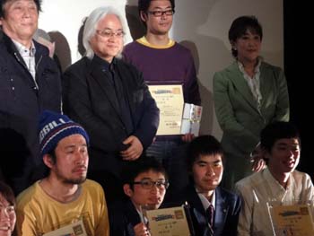 受賞する生徒(右は桝井省志プロデューサー) | 記念撮影(右上は八丁座オーナー蔵本順子さん) |